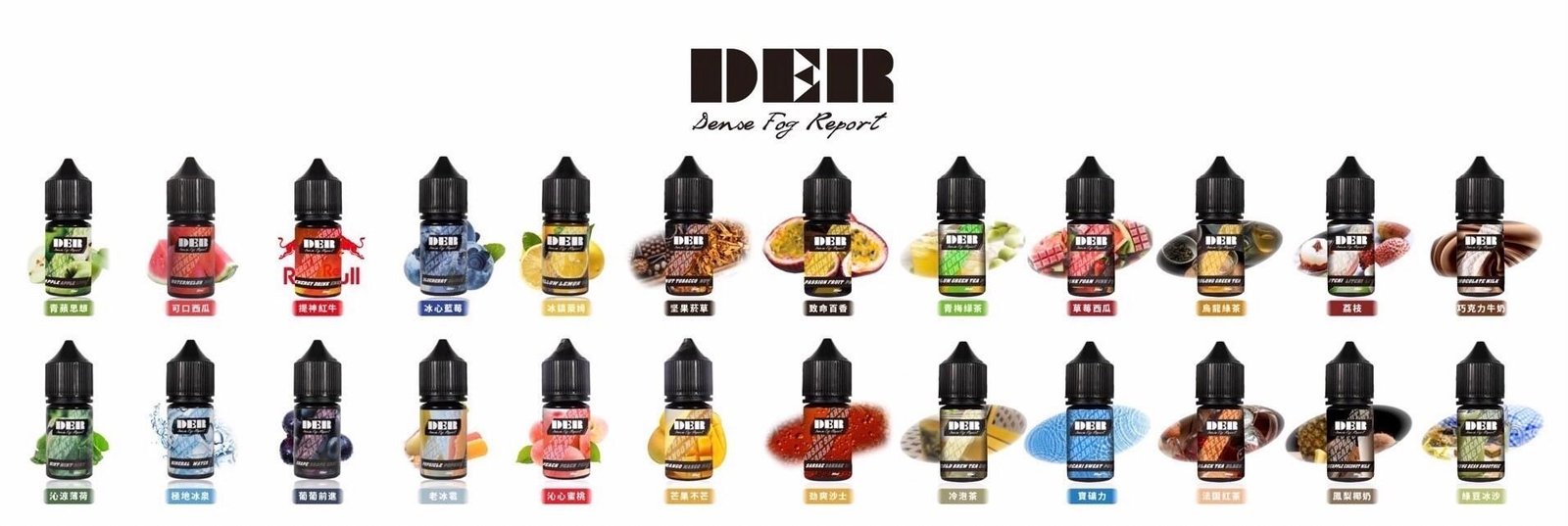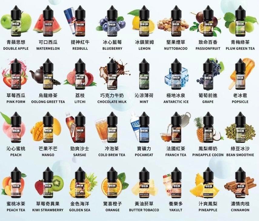 橙子檸檬 百香果蔓越莓 巧克力牛奶 草莓奇異果 堅果煙草 綠豆冰沙 鳳梨椰奶 法國紅茶 蜜桃冰茶 烏龍綠茶 草莓西瓜 青梅綠茶 寶礦力 冷泡茶 百香果 老冰棍 水蜜桃 沙士 荔枝 芒果 冰泉 薄荷 檸檬 藍莓 紅牛 西瓜 蘋果 葡萄 肉桂(新口味) 鳳梨(新口味) 玫瑰花茶(新口味) 花生黃油(新口味) 火龍果(新口味) 鐵觀音(新口味) 香芋冰淇淋(新口味)